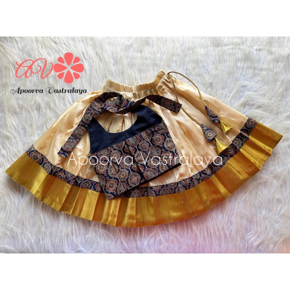 NavyBlue Ajrak Print Kerala Kasavu Lehenga