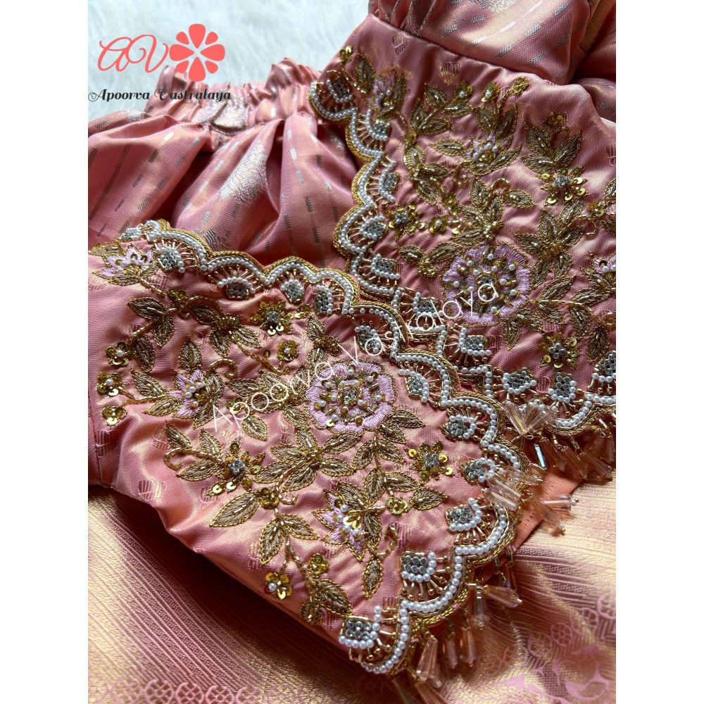 Fabric: Elite kanchi silkLining: CottonTop Length: Normal topSleeve type: Puff sleeves with aari bor..