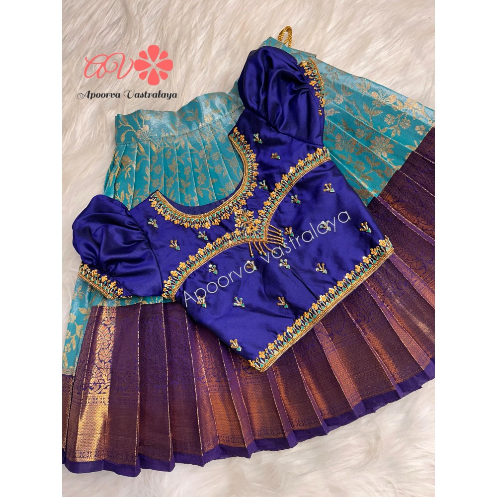 Sky blue and Navy blue Aari Silk Lehenga
