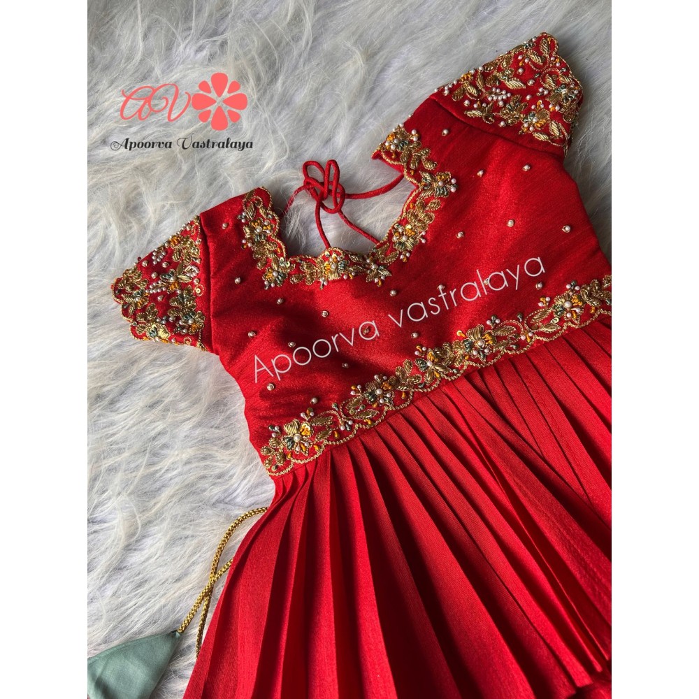 Fabric: Banarasi Katan silkLining: CottonLength: Ankle lengthSleeve type: Ruffle SleevesWork: Handst..